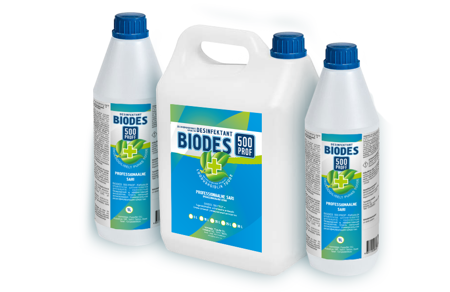 BIODES 500 PROF complies with the standards of safety and effectiveness of disinfecting agents and corresponding to the requirements of Sanitary Rules and Standards No. 21-112-9, does not have a toxic effect on the body and belongs among low-hazard chemical compounds (hazard class 4 pursuant to GOST 12.1.007-76). It is not irritant to skin and is mildly irritant to mucous membranes of upper respiratory tracts and eyes.